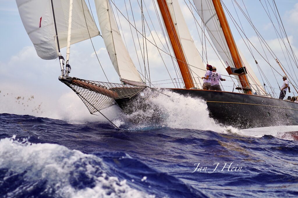 In a steady, perfect racing wind, the Caterpillar course awaited the boats today, a course with something for everyone. Reaching, fetching, tacking, flying spinnakers; it’s a sailor’s dream course. Athena flew her rather flirty, distinctive spinnaker in grand style, while Ashanti IV stepped out of history with all sails flying, drawing gasps of admiration as she took line honours for the whole fleet. The Caribbean sea was a spectacle worth seeing with spinnakers and sails etched against the sky.